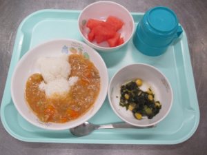 お誕生日会の給食のメニューは、夏野菜カレー、海藻サラダ、すいかでした。