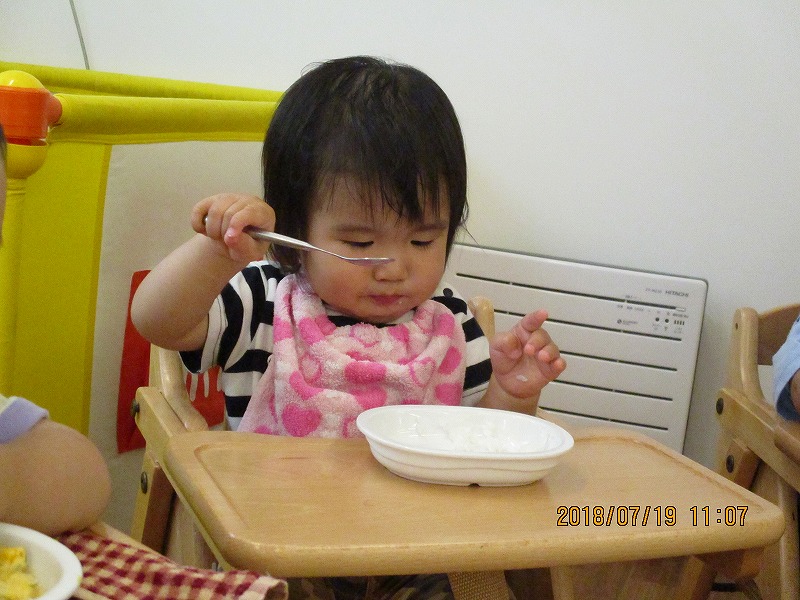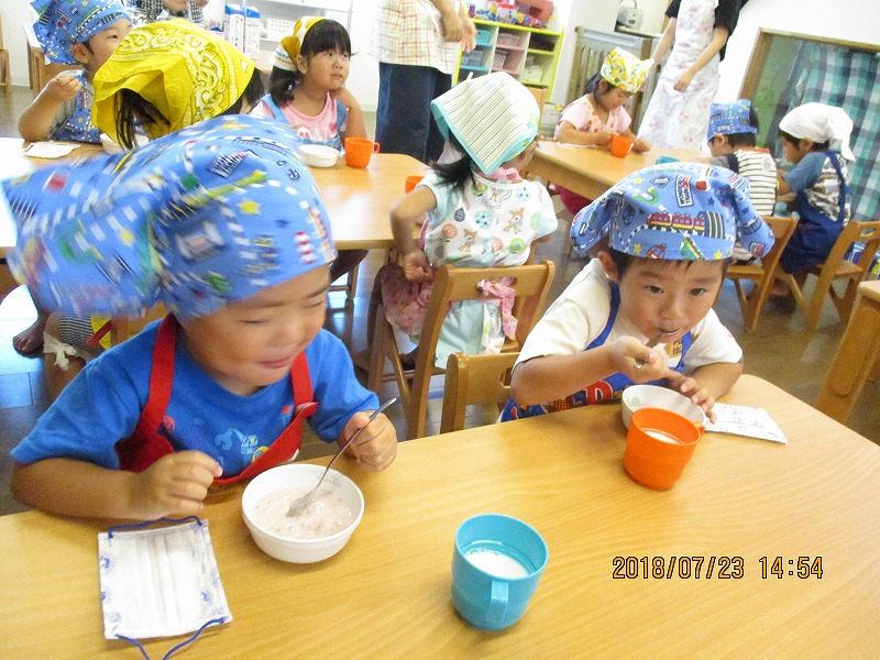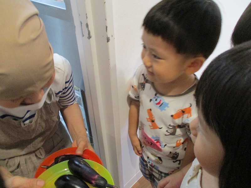 お誕生日会の給食のメニューは、夏野菜カレー、海藻サラダ、すいかでした。
