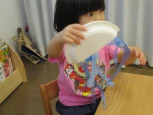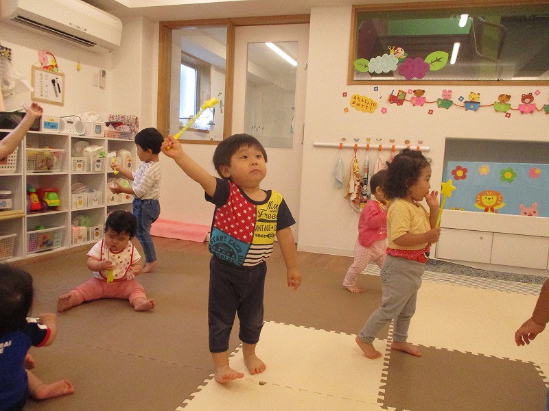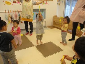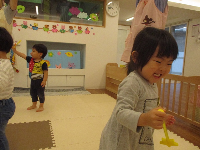 お星さまを持って、音楽に合わせてリズム遊びをしたね。