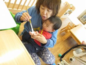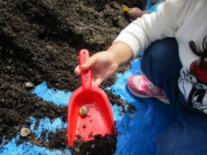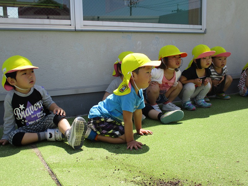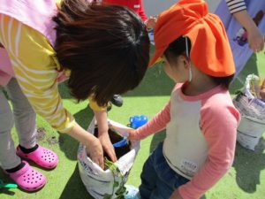 赤い根っこを横にして、土の中に植えようねってお話聞いたね。