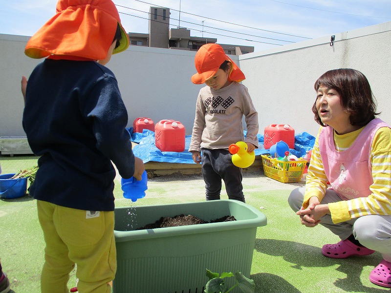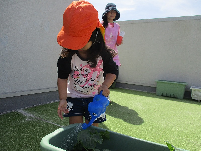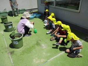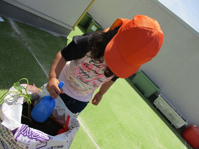 みかん組はプランターに枝豆、トマト、きゅうり、とうもろこしを植えました。