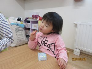 お部屋ではチラシ遊びをしたり、手と足の手形を取ったりしました。